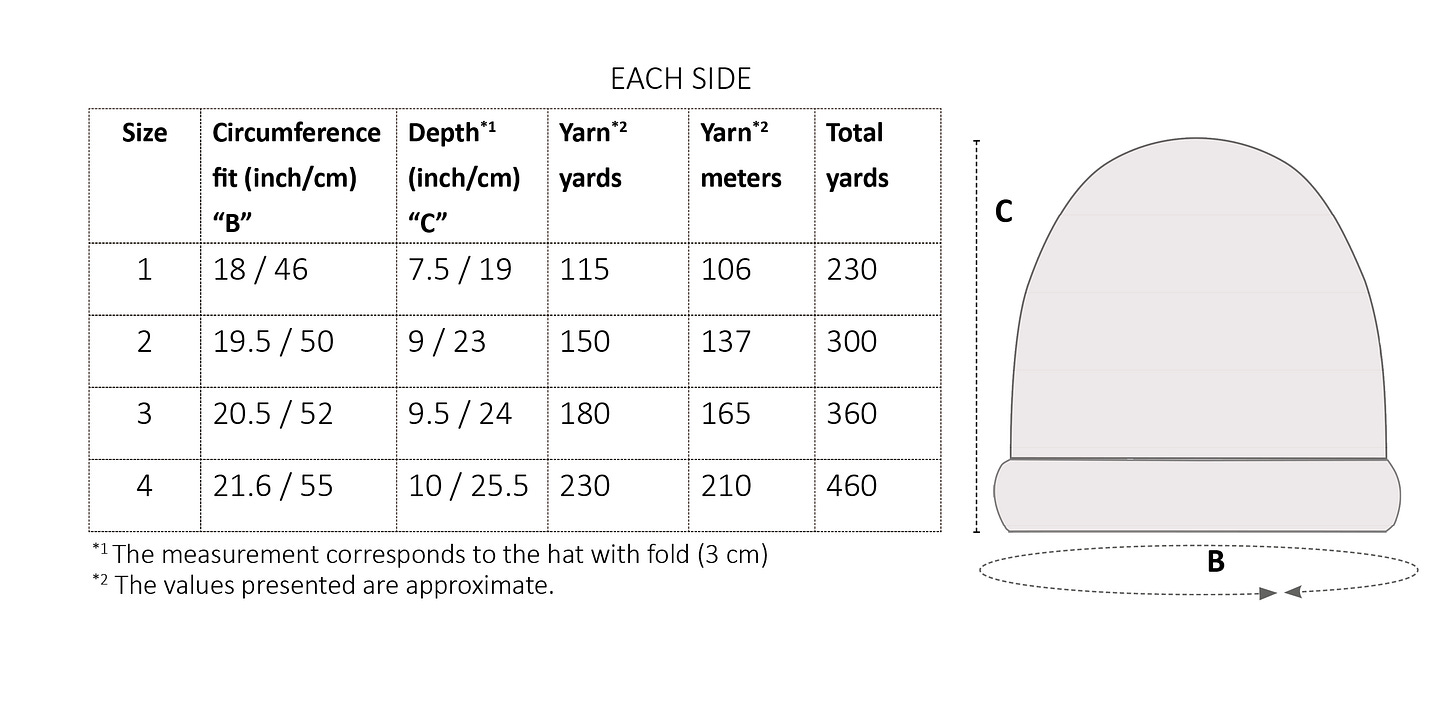 To choose the size, I suggest selecting a size that has between 1â-2â / 2-5 cm of negative ease compared to your head circumference. The garment measurements are approximate values; they depend on the yarn weight used and each knitterâs tension.